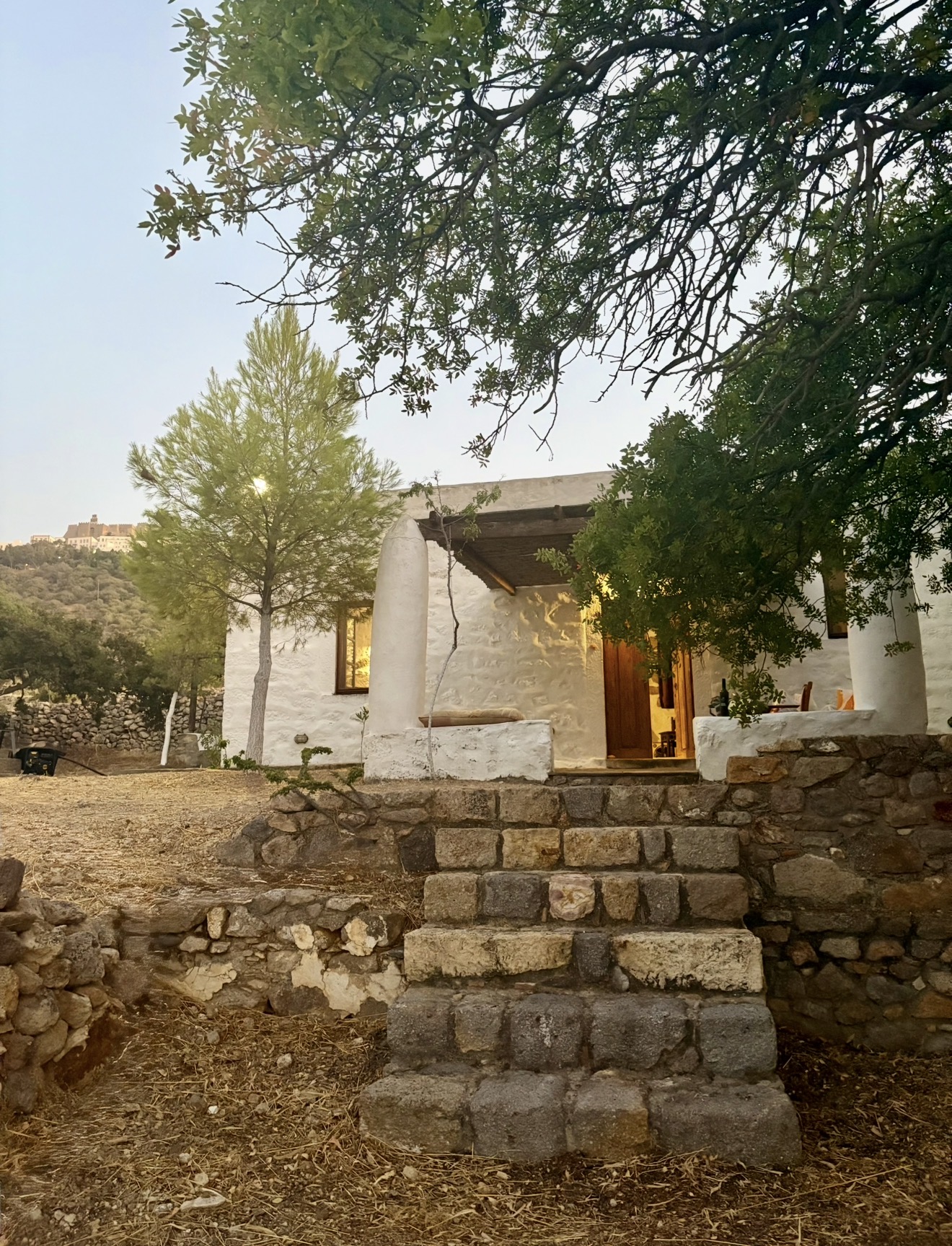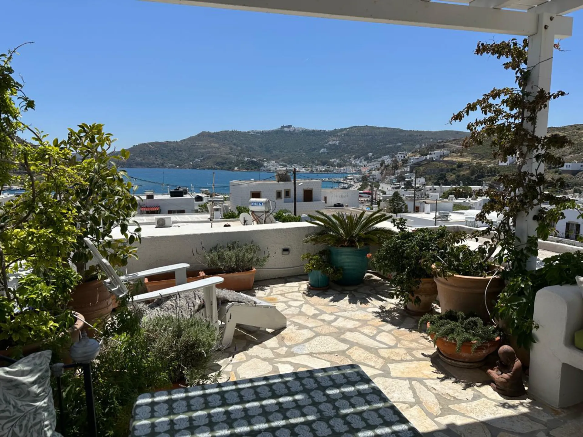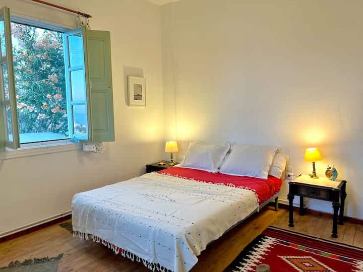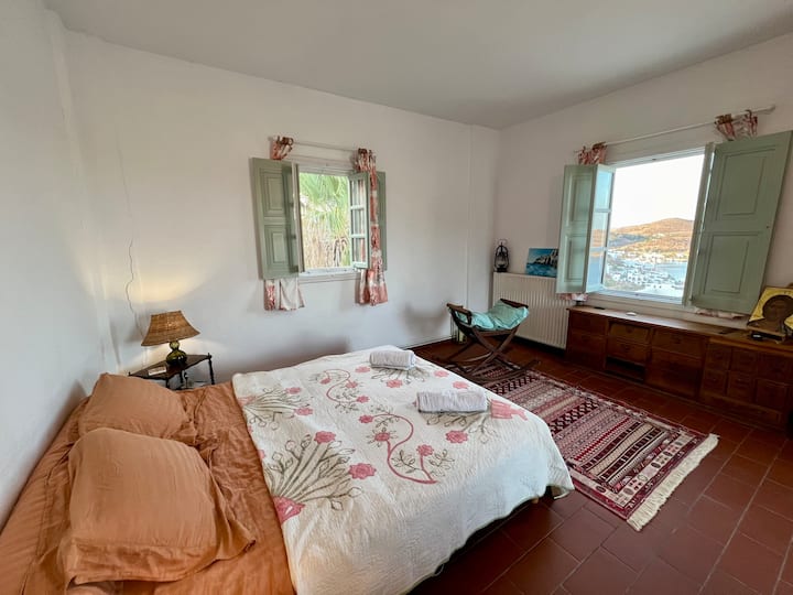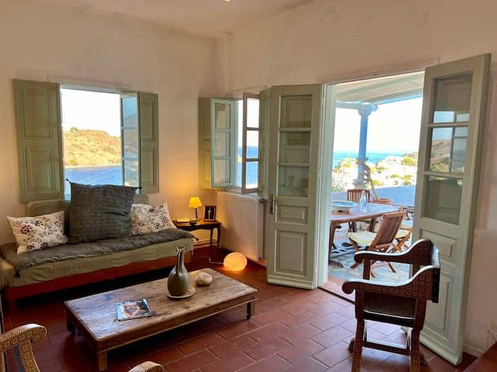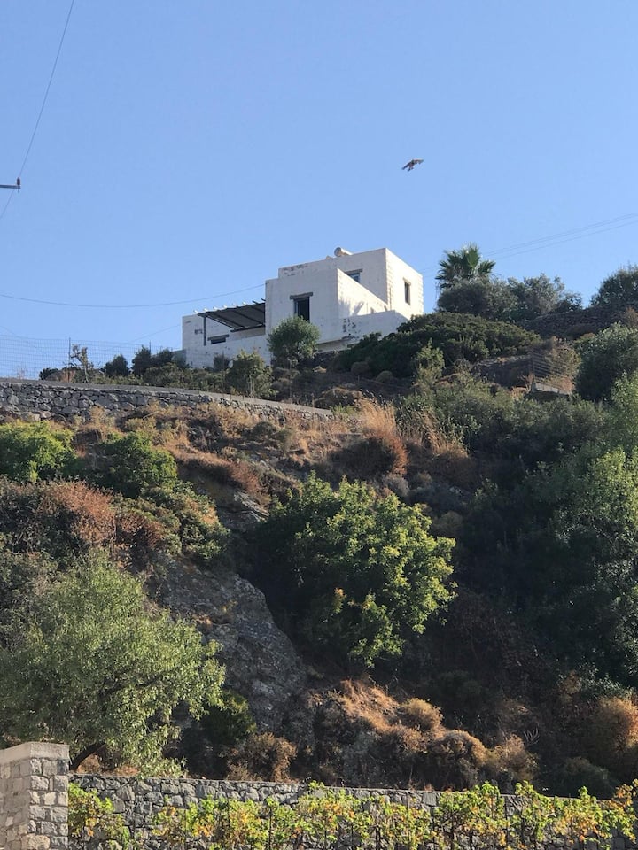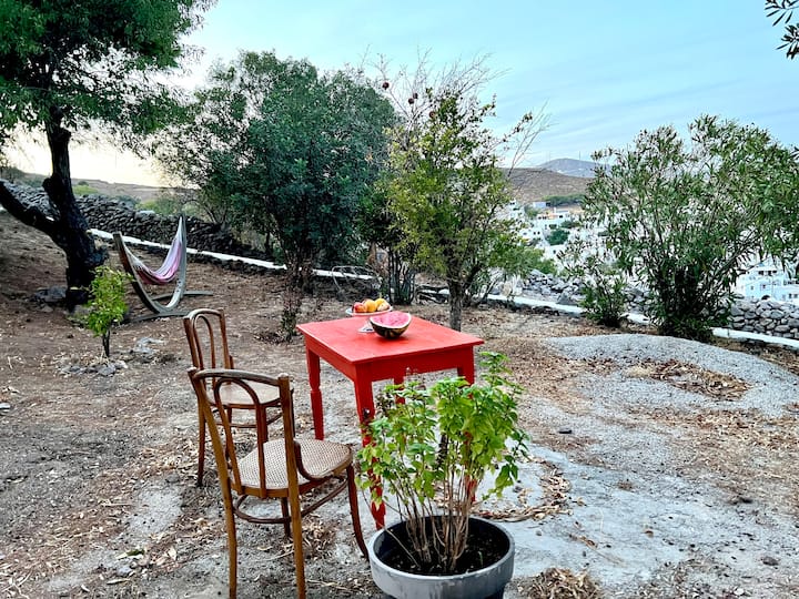 A beautiful and spacious house with an exceptionally large garden, breathtaking view of the island and the holy monastery of Chora. The major house is composed of a spacious, fully-equipped kitchen, a winter lounge, a south-east-facing dining terrace, a bathroom and two master bedrooms, one of which is upstairs with it’s private 30 m2 terrace.…