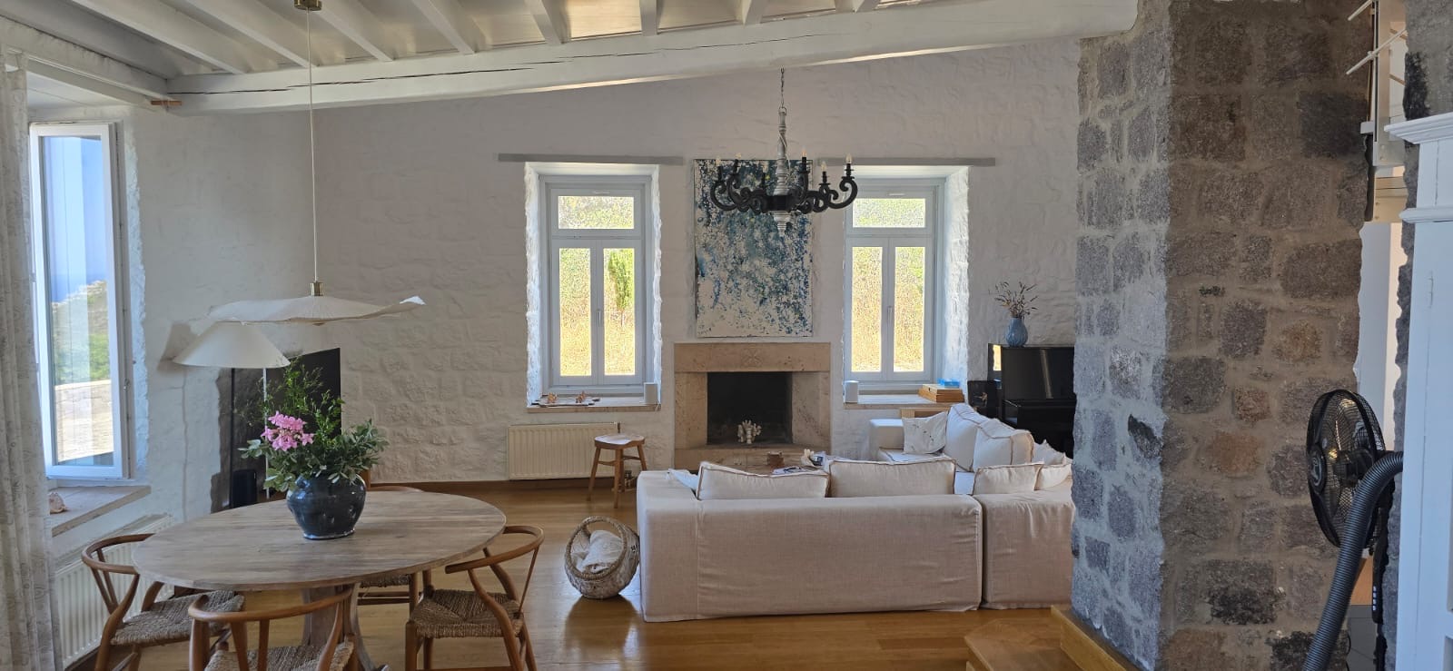 On the picturesque island of Patmos this detached luxury villa is overlooking at Chora and its unique Castle, from just a few meters away, whilst offering amazing sunset sunrise views too. Perfectly situated on the top of the hill, this bio-climatic villa offers naturally cool climate even at the hottest days, just by opening a window. At all floors of this exclusive accommodation one can see the unique materials this magnificent villa was built, enjoy the panoramic views from its verandas.