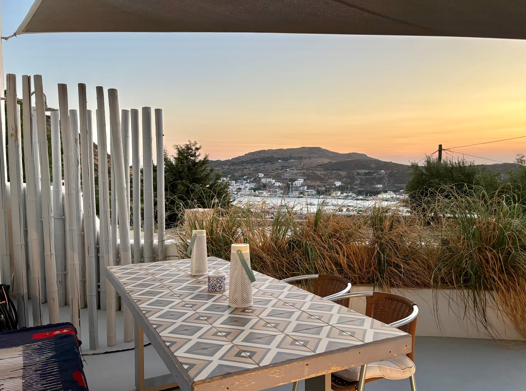 Matina’s Tiny Home and the adjacent Vicky’s Guest House are situated in a secluded rural area, though very close to some of the main touristic spots like the port of Patmos(Skala) and the beach of Meloi. The two little dwellings, facing west, boast one of the most fascinating sunsets on the island with epicenter of the view the Patmos Yacht Marina.
