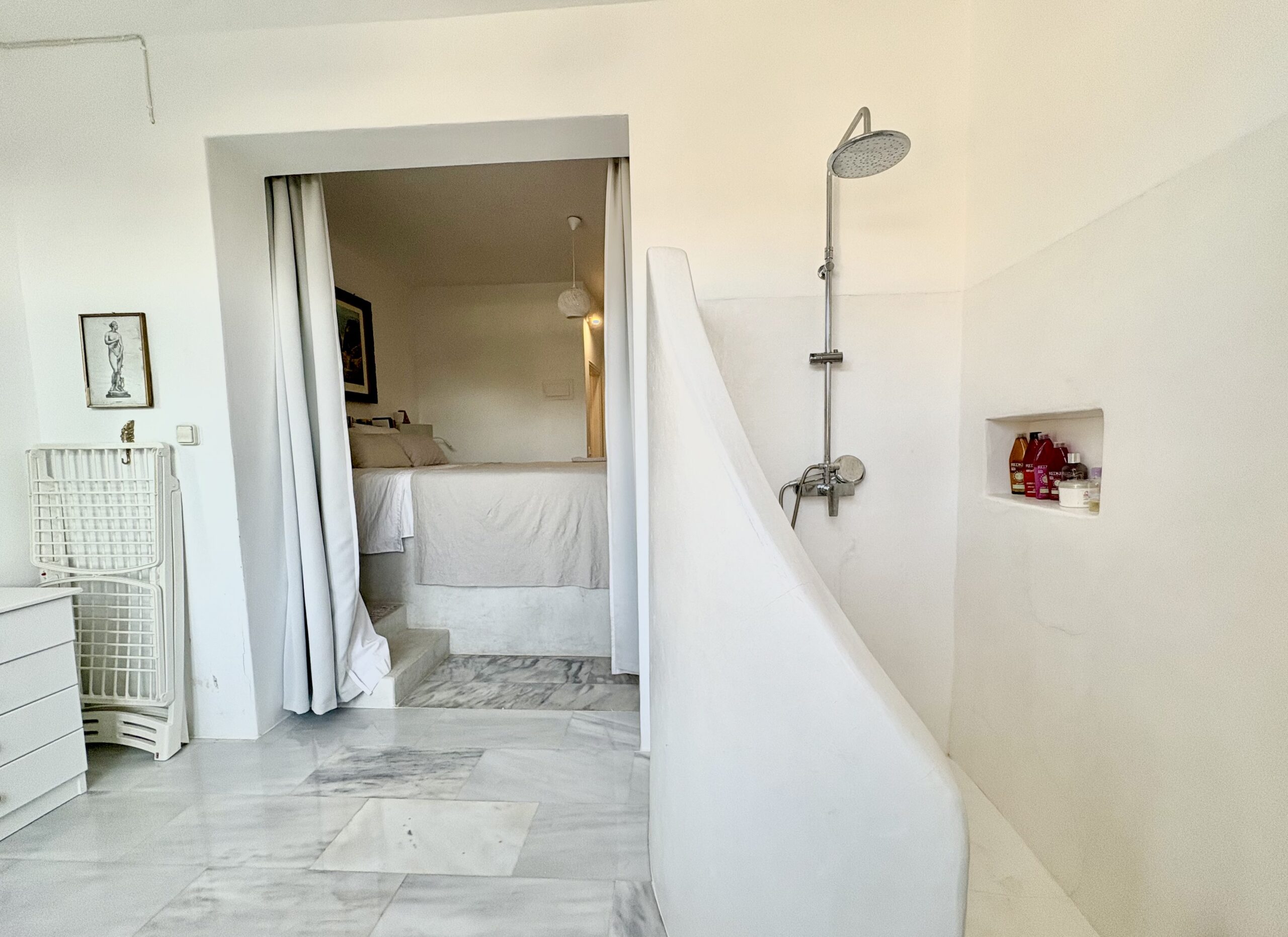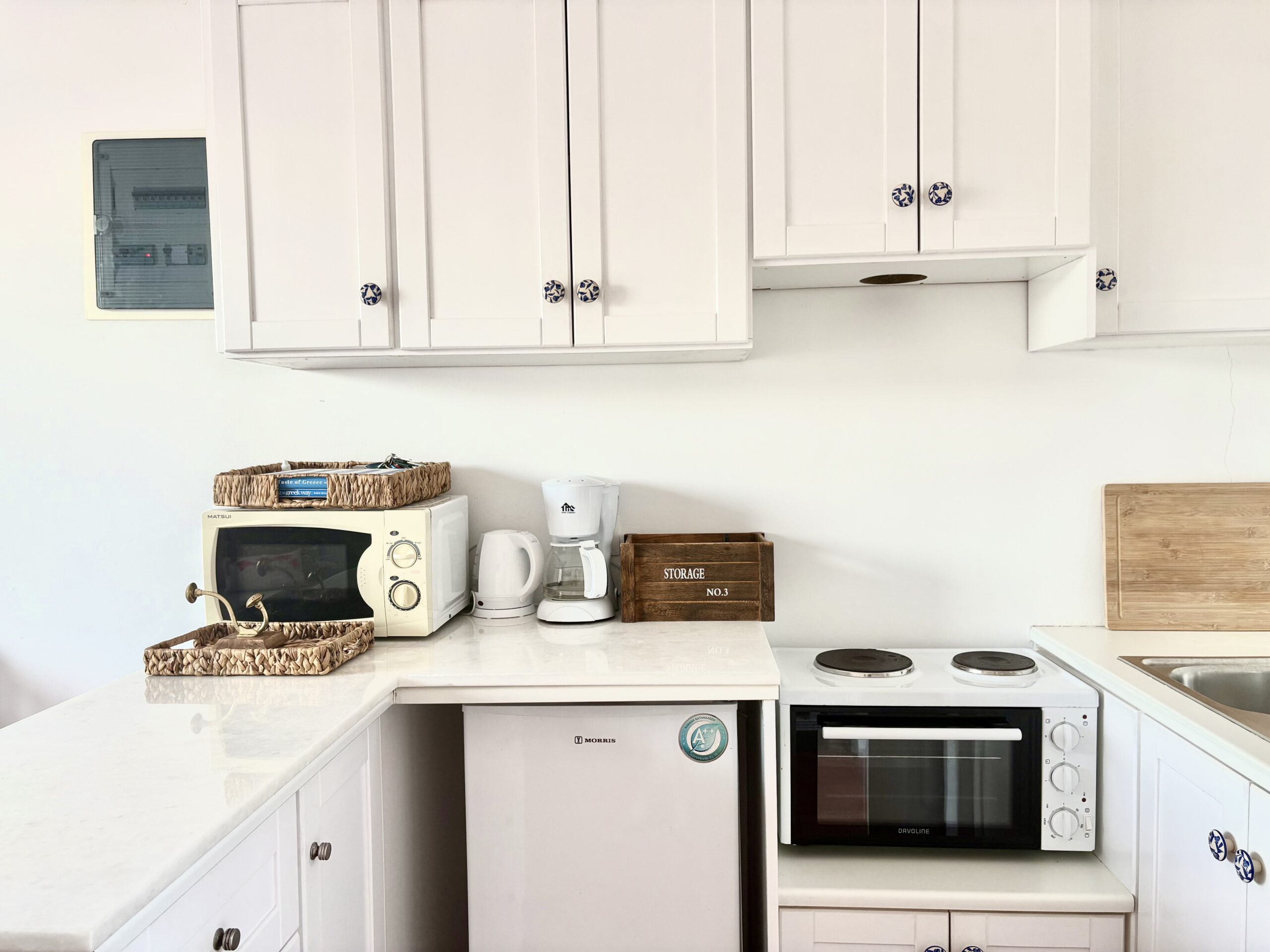 The two-person apartment (30sm) of Villa Sofia pays homage to simplicity making clear that clean-cut decorative approach wins on the points. This microcosm of harmony is set in the ground floor and includes an equipped kitchen, bathroom, smart TV with Netflix and a sitting-room. It is a single space which combines gracefully the minimal references…