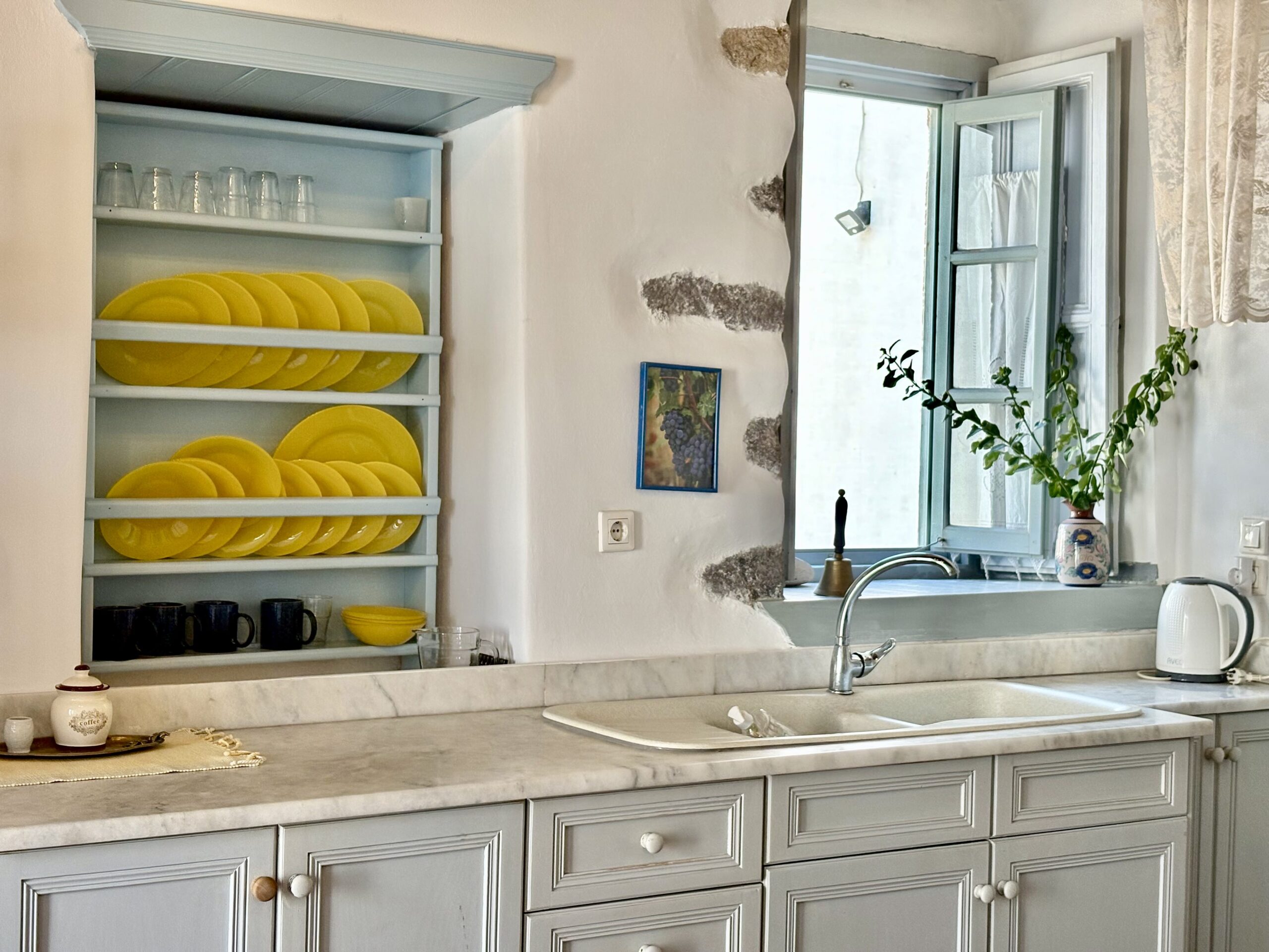 Ενα ψηλοτάβανο σπίτι που συνδυάζει τον παραδοσιακό χαρακτήρα με την άνεση. Το εσωτερικό του είναι διαμορφωμένο σε ενιαίο χώρο, που περιλαμβάνει άνετο καθιστικό, τραπεζαρία και πλήρως εξοπλισμένη κουζίνα. Το σπίτι διαθέτει επίσης μπάνιο με ψηφιδωτά πλακάκια και ντουζιέρα τύπου walk-in, καθώς και πλυντήριο ρούχων για μεγαλύτερη ευκολία. Ένας ζεστός και φιλόξενος χώρος, ιδανικός για όσους αναζητούν ηρεμία, αυθεντικότητα και την παραδοσιακή νησιώτικη γοητεία.