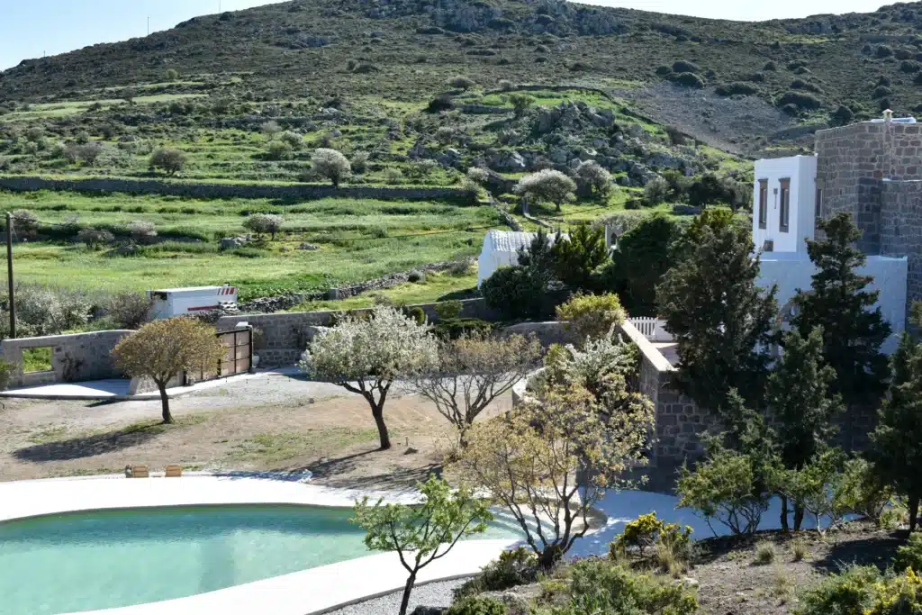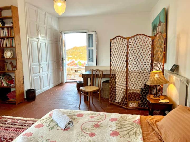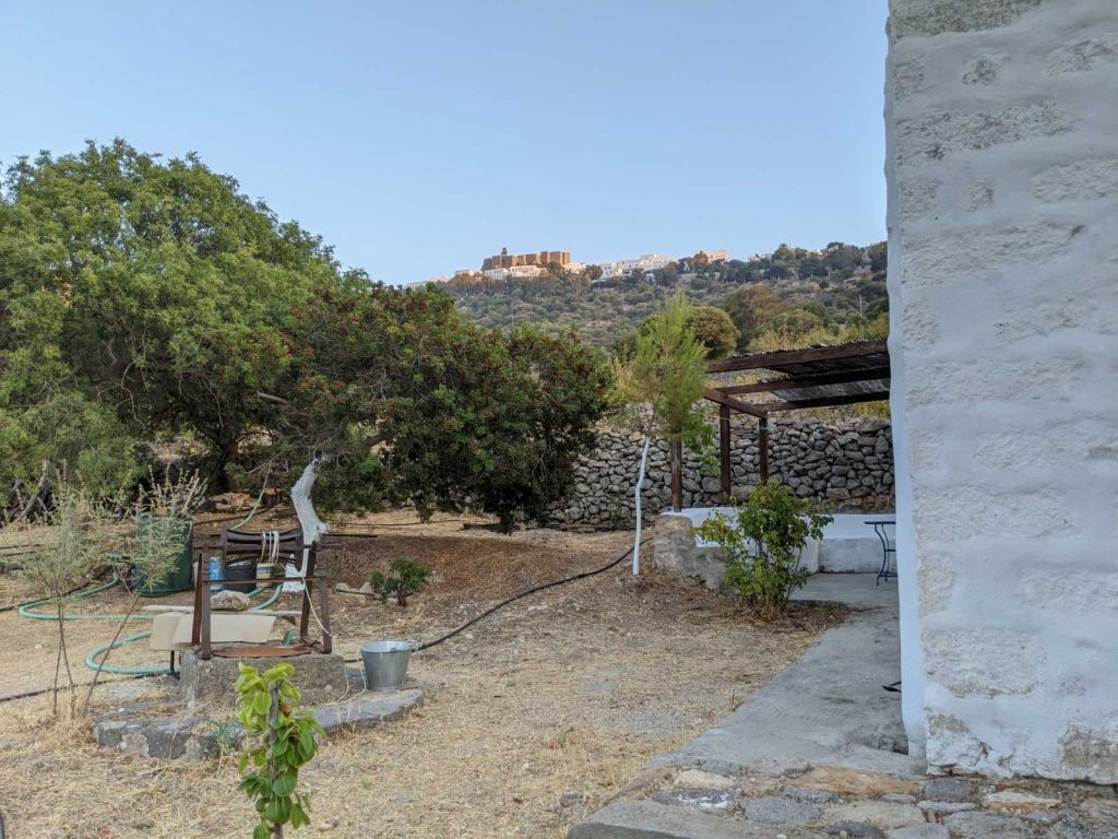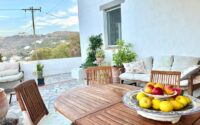 A beautiful and spacious house with an exceptionally large garden, breathtaking view of the island and the holy monastery of Chora. The major house is composed of a spacious, fully-equipped kitchen, a winter lounge, a south-east-facing dining terrace, a bathroom and two master bedrooms, one of which is upstairs with it’s private 30 m2 terrace.…