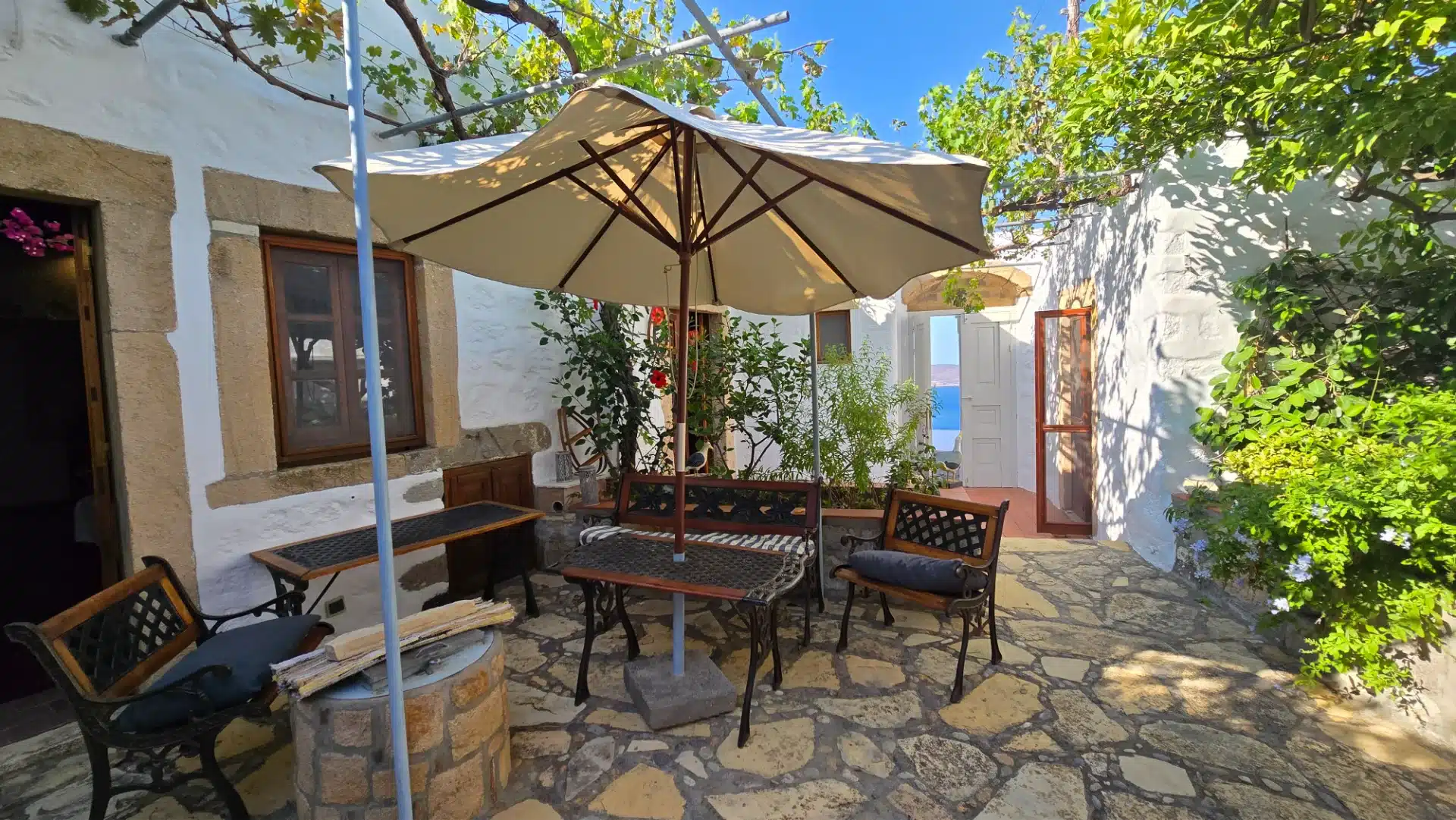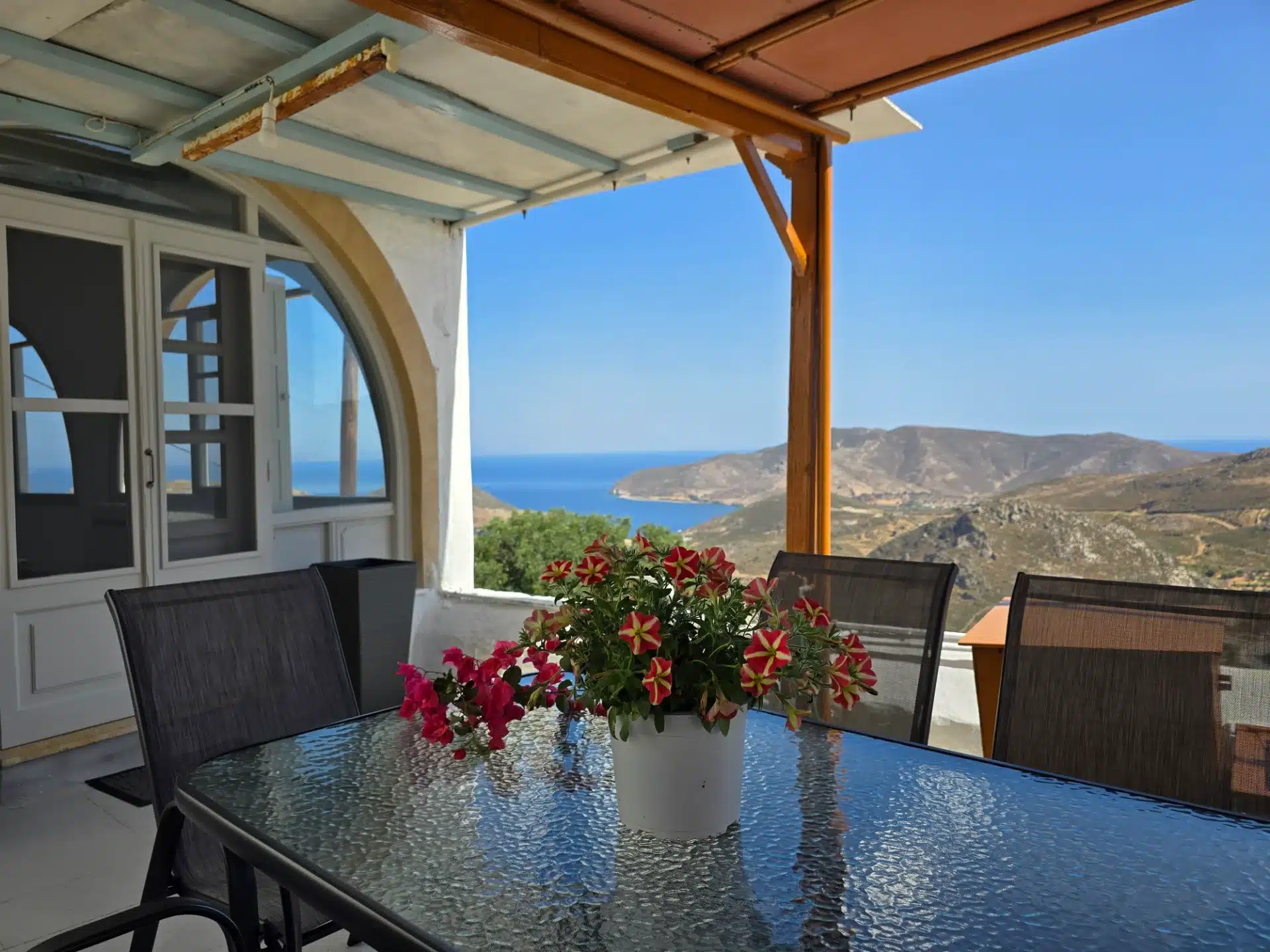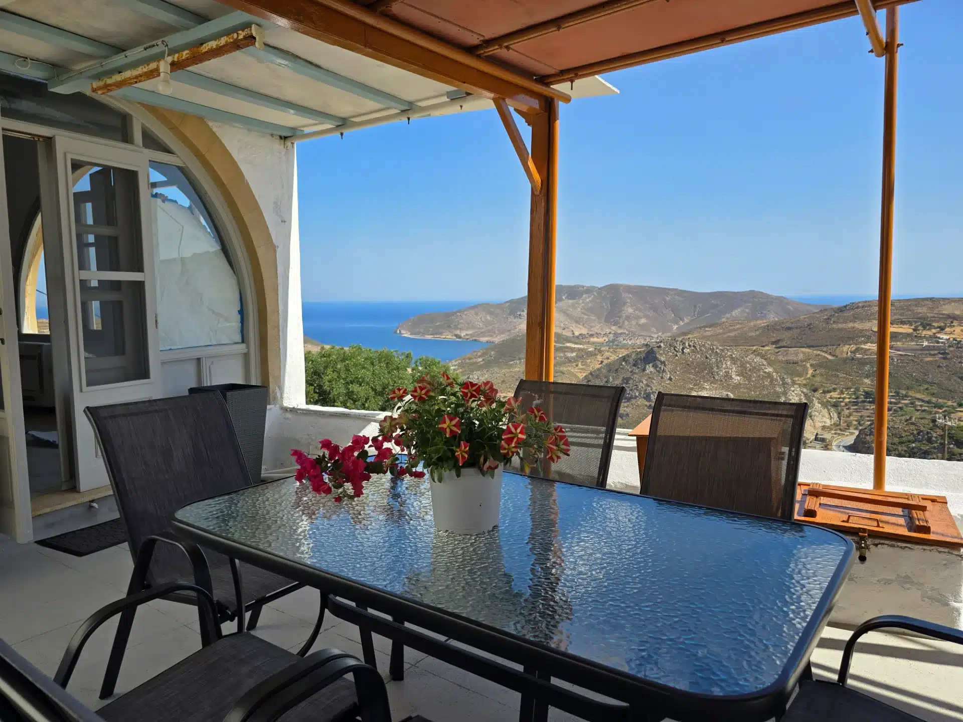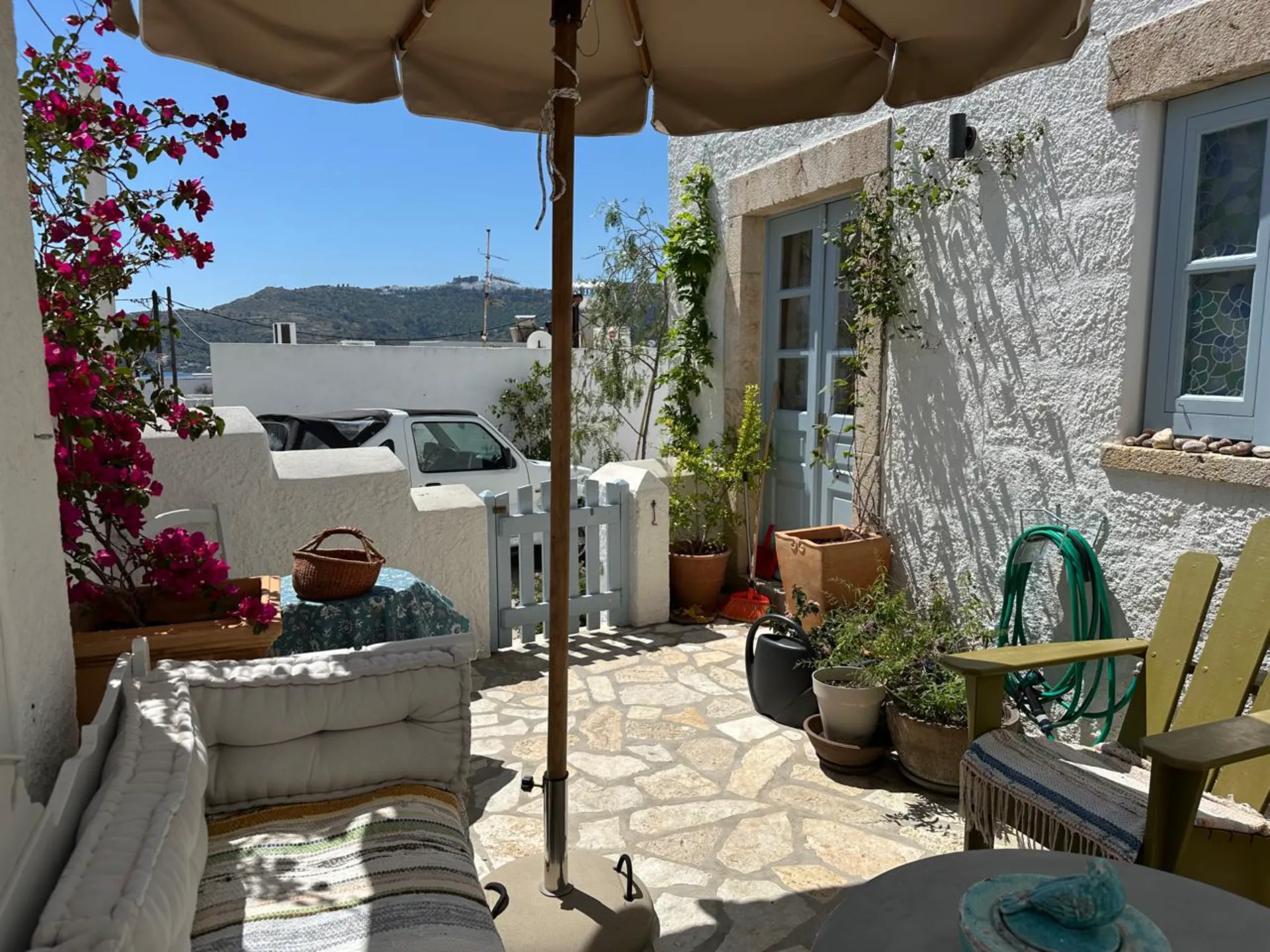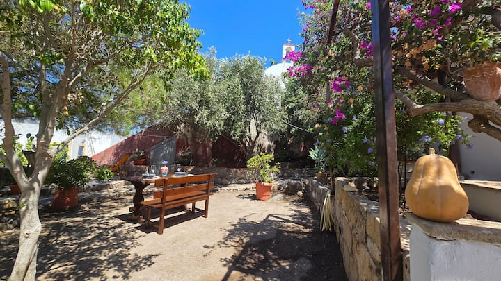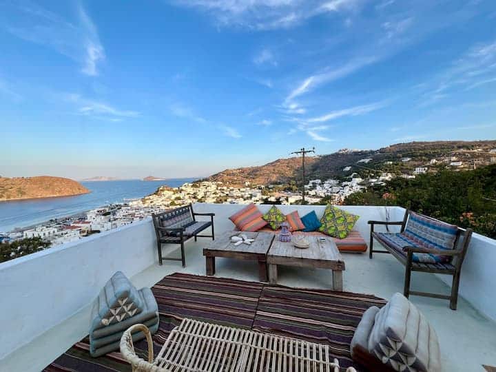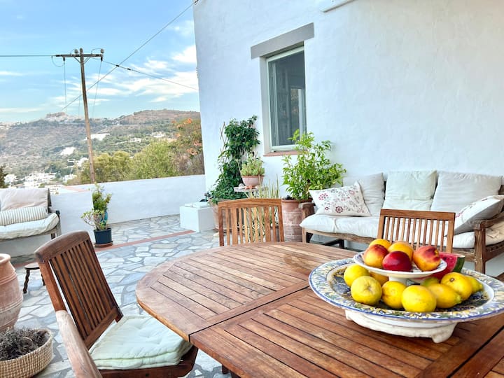 A beautiful and spacious house with an exceptionally large garden, breathtaking view of the island and the holy monastery of Chora. The major house is composed of a spacious, fully-equipped kitchen, a winter lounge, a south-east-facing dining terrace, a bathroom and two master bedrooms, one of which is upstairs with it’s private 30 m2 terrace.…